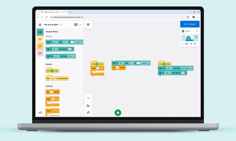 The new Coding palette provides an intuitive student interface with word or icon-based block coding and is accessible via web browser or iOS app. There is no text-based coding in the app, but LEGO Education will make the API (Application Programming Interface) publicly available with a Python installation package, meaning that users will be able to use their favourite text-based programming tool to interact with LEGO Education Hardware